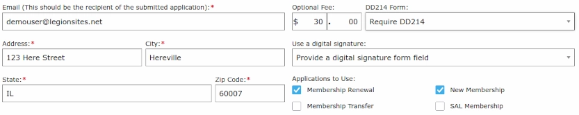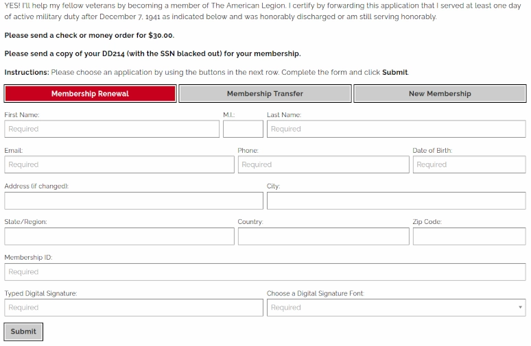 There are several membership applications that can be used on your Legionsite: Renewal, Transfer, New and Sons of American Legion Membership application forms. The forms can all be used or just one of them. Once a user enters their information, the input is emailed to the Post and follow-up instructions provided to the user to mail in any required payment or DD214 form. The configuration information needed to utilize these forms is just a recipient email along with a mailing address. This recipient email address is not shown on the website. A couple of optional items that can be set includes a fee, the inclusion of a DD214 form or a digital signature.